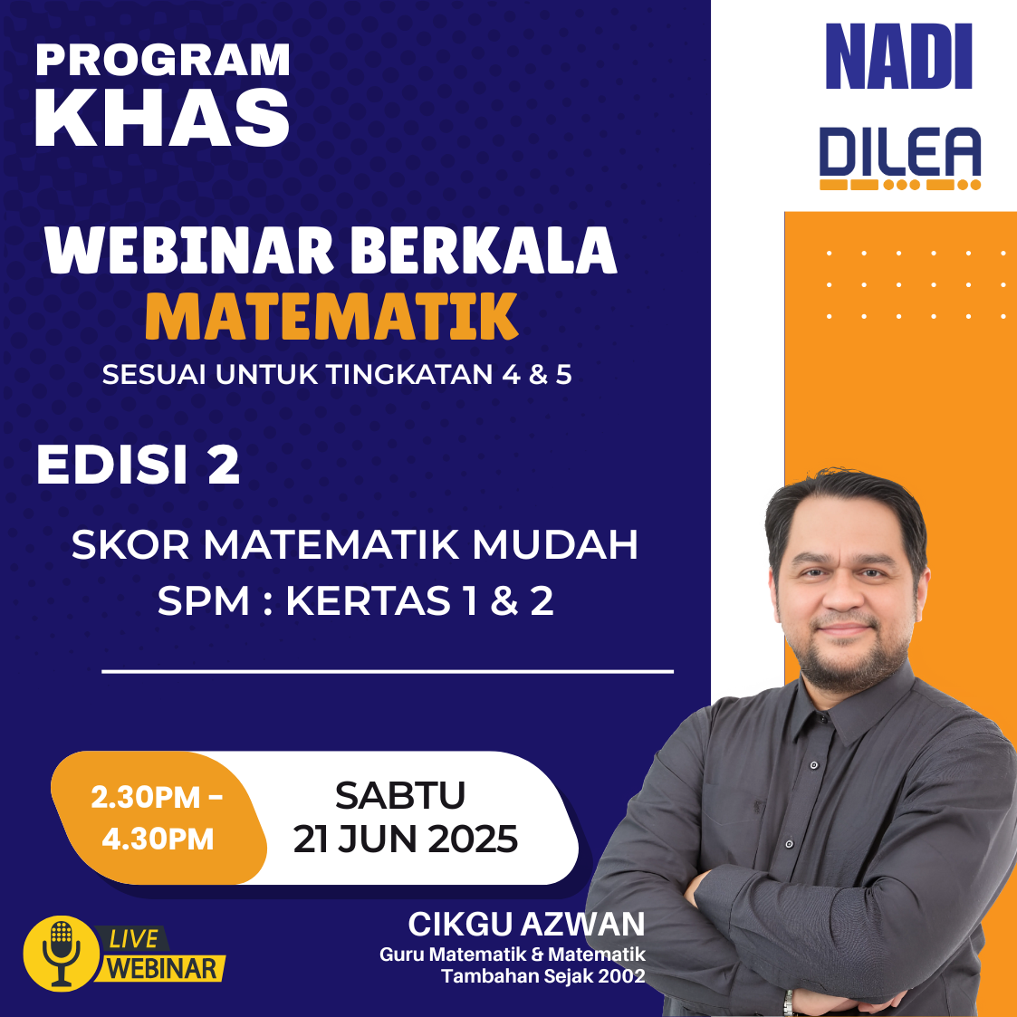 ๐ข [Perkhidmatan Pintar NADI-Nurture DILEA Digital Learning] ๐ข ๐ Program Khas: Pendaftaran Webinar Berkala Matematik Edisi Kedua kini dibuka! ๐ ๐ Tarikh: 21 Jun 2025๐ Lokasi: NADI Kampung Tellian Ulu๐ฏ Terbuka kepada pelajar Tingkatan 4 & 5 yang ingin tingkatkan kemahiran matematik! […]