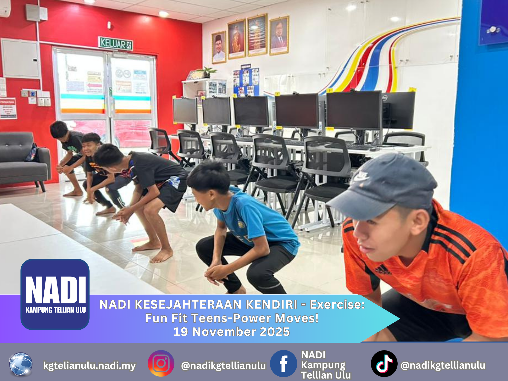 Objektif NADI Kesejahteraan Kendiri – Exercise – Fun Fit Teens: Power Moves adalah untuk menggalakkan pelajar sekolah menjalani gaya hidup aktif dan sihat, meningkatkan kecergasan fizikal, membina kekuatan otot, serta memupuk semangat kerjasama melalui aktiviti senaman seronok dan berkesan.