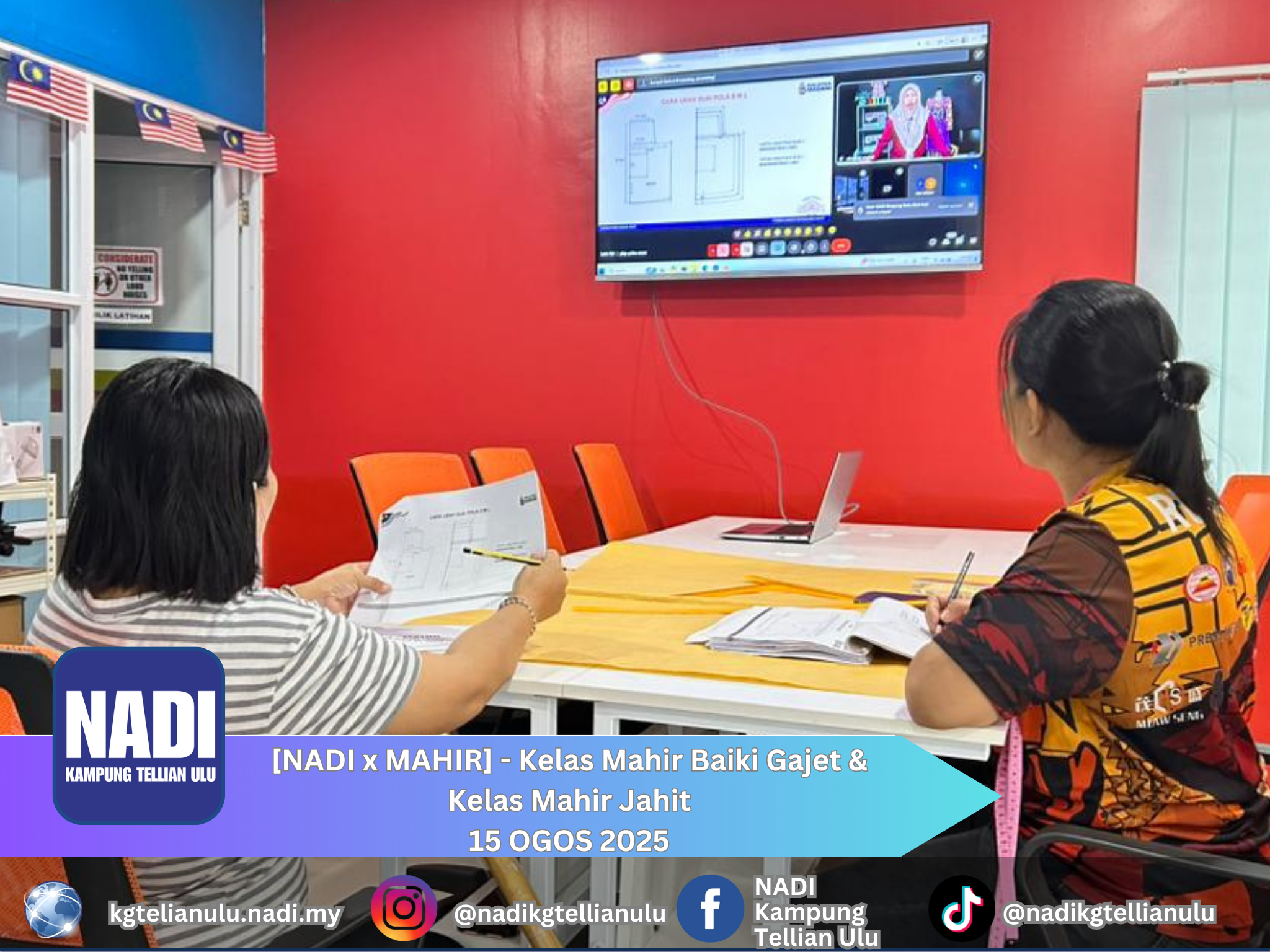 Program [NADI x MAHIR] – Kelas Mahir Baiki Gajet & Kelas Mahir Jahit bertujuan meningkatkan kemahiran komuniti Kampung Tellian Ulu. Peserta akan belajar membaiki gajet harian dan menjahit dengan kemahiran berkualiti, memperkasakan diri dan menambah pendapatan. Program ini juga menggalakkan kerjasama dan pembelajaran berterusan dalam komuniti. Sertai dan kembangkan ilmu bersama! ![]()
