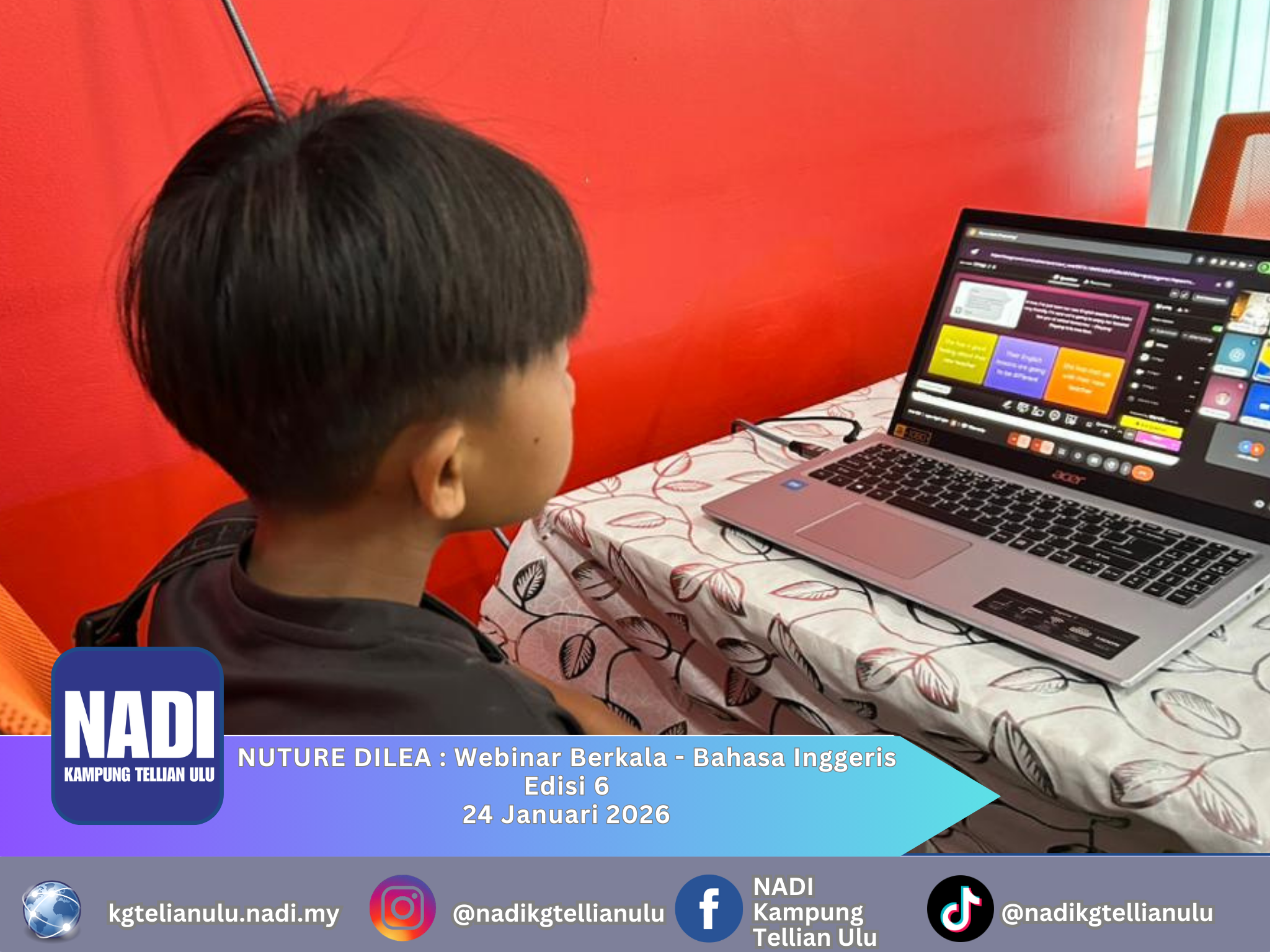 Sabtu, 24-Jan-2026 02.30-04.30 petang NADI Kampung Tellian Ulu Webinar NUTURE DILEA Edisi 6 bertujuan memperkukuh kemahiran Bahasa Inggeris pelajar sekolah melalui sesi interaktif berkala. Ia memfokuskan latihan pertuturan, kefasihan tulisan dan pemahaman konteks global, sambil membina keyakinan berbahasa. Akhirnya, program […]